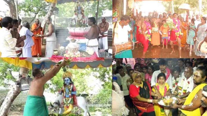 இறைவன் சாம்பல் வண்ணத்துடன் முக்கண் கொண்டவராயும், இளமதியை சென்னியில் சூடியவாறும், கோரைப்பற்கள் கொண்ட உருமாய் இரண்டு பெண்களுடன் தோன்றினார்.
